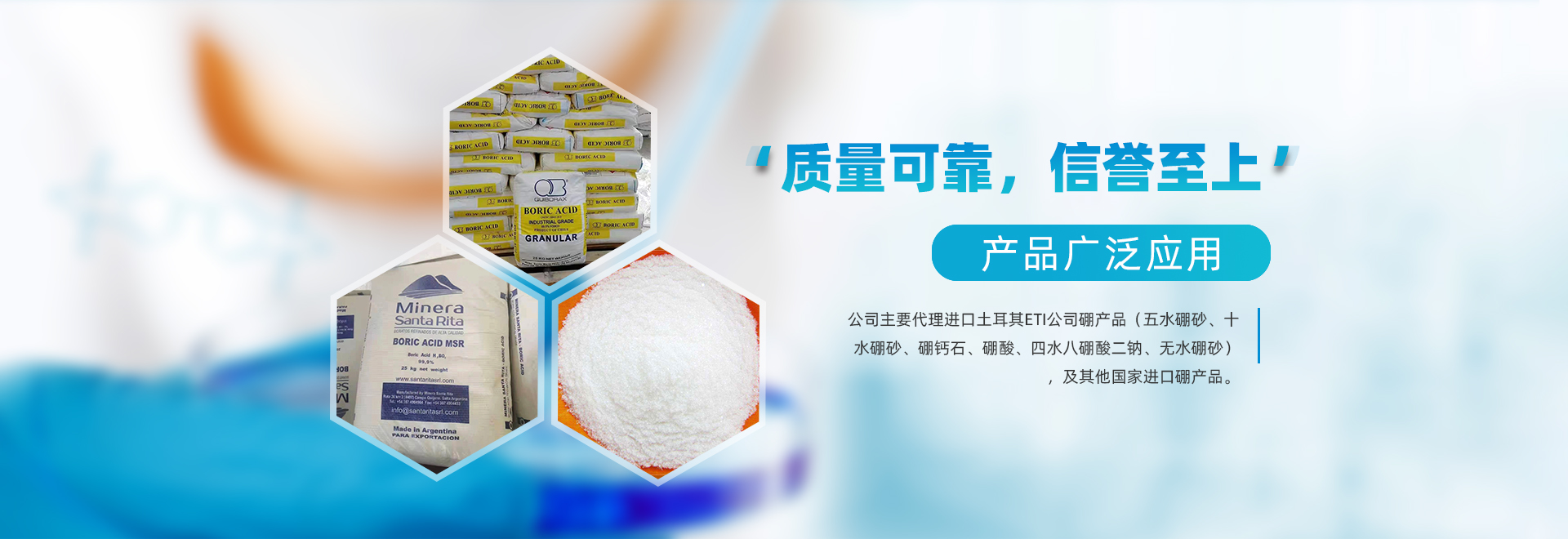 公司主要代理進口土耳其ETI公司硼產品(進口四水八硼酸鈉、進口五水硼砂、進口速溶硼、十水硼砂、硼鈣石、硼酸、無水硼砂) , 及其他國家進口硼產品。種類齊全,批發價格合理,品質保證,庫存充足。